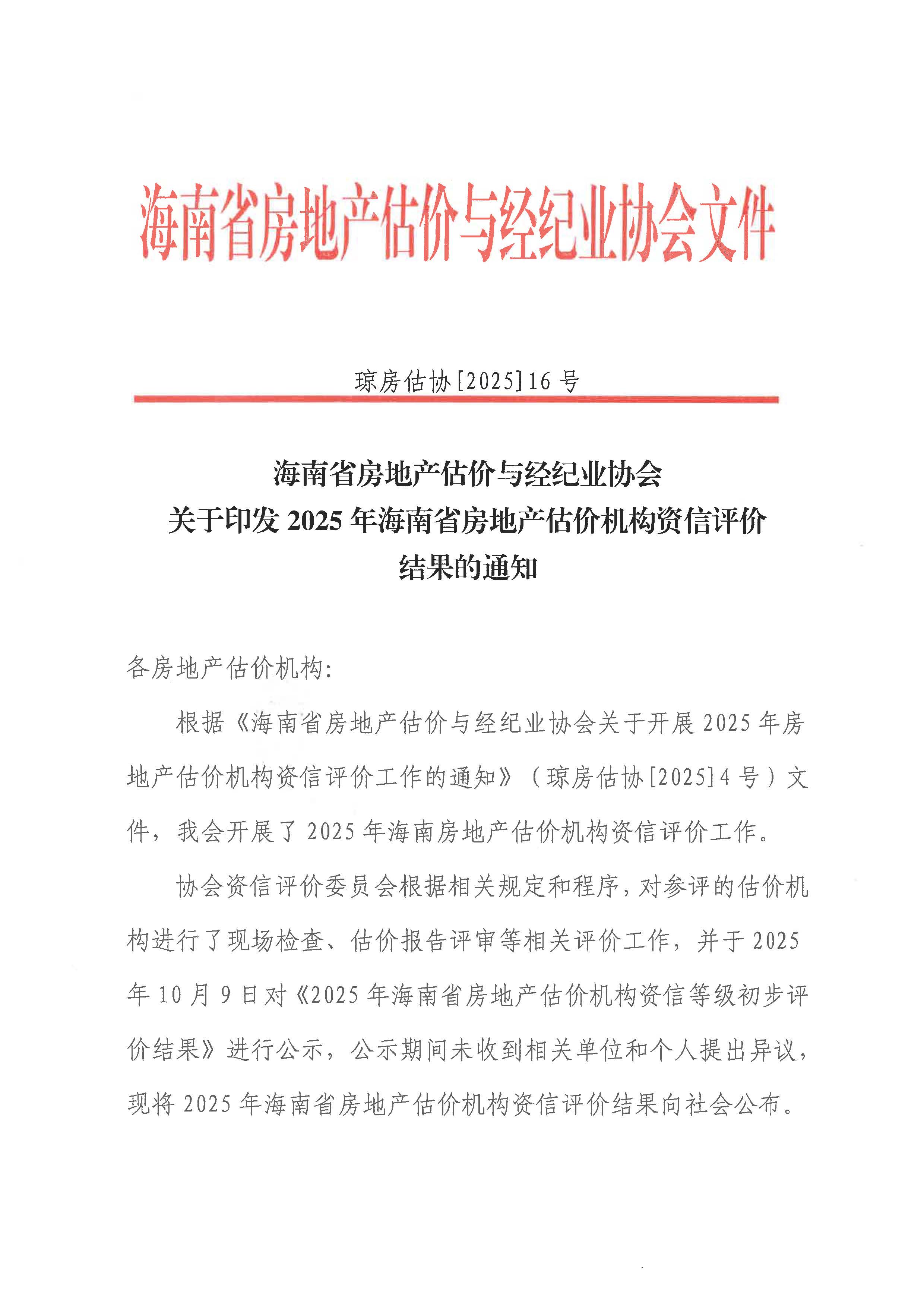 关于印发2025年海南省房地产估价机构资信评价结果的通知