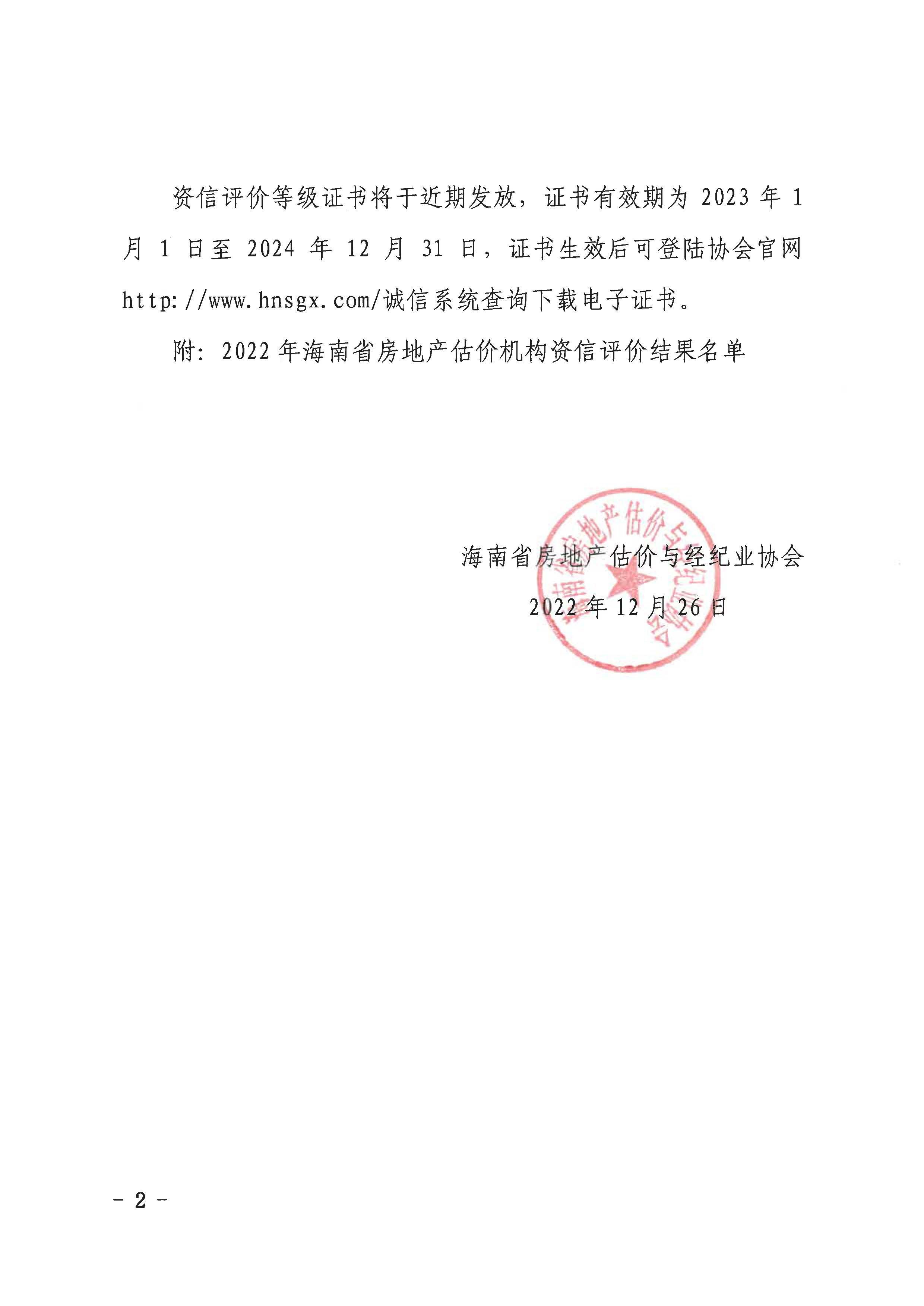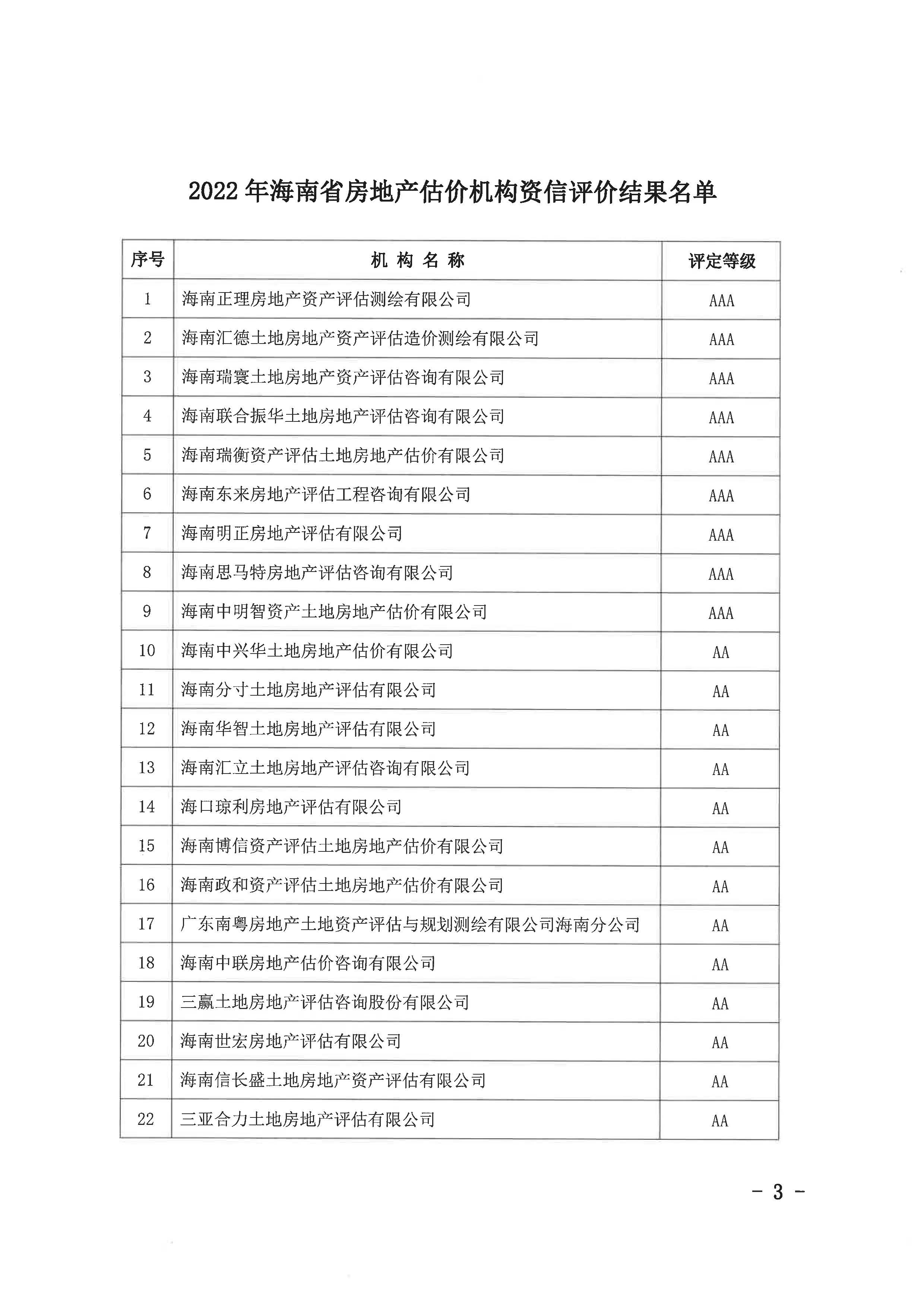关于印发2022年海南省房地产估价机构资信评价结果的通知