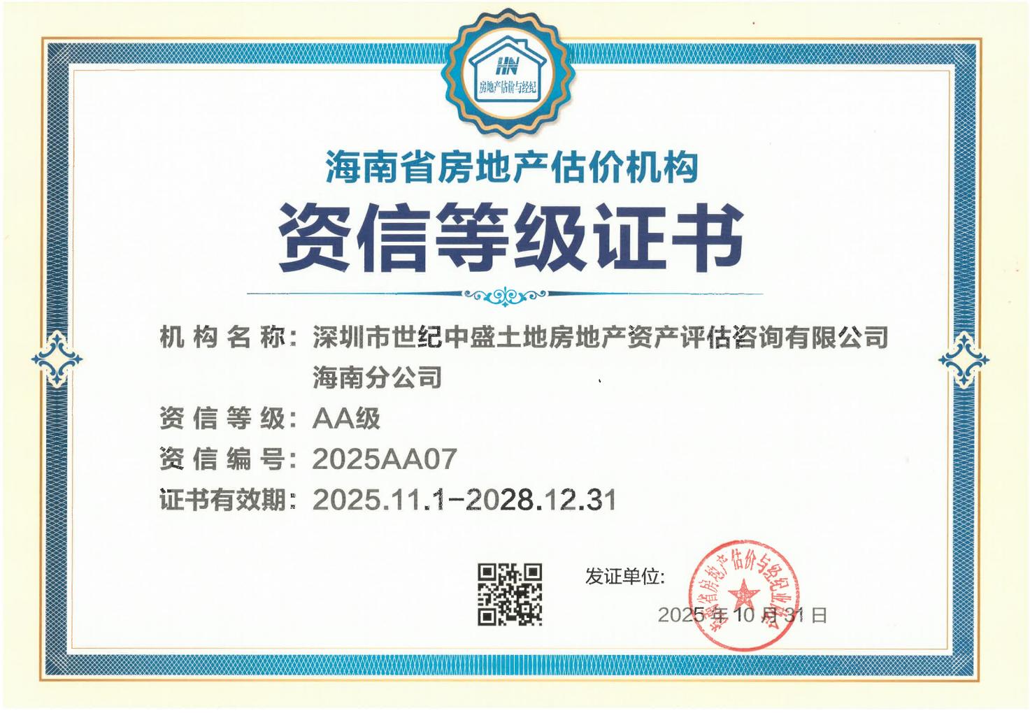 深圳市世纪中盛土地房地产资产评估咨询有限公司海南分公司2025AA07